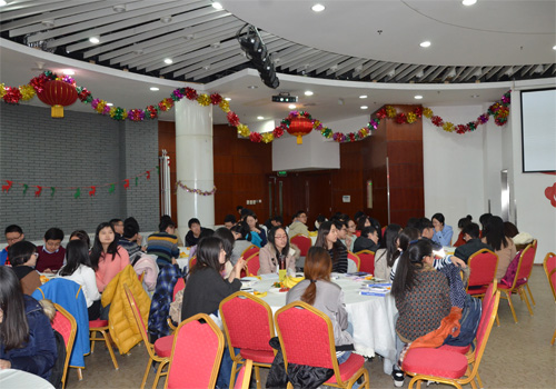 此后,迎新会进入了轻松欢快的游戏环节。第一个游戏名为《你来比划我来猜》,2014级新生与高年级师兄师姐搭配组队。一位背对屏幕,另一位运用肢体语言向对方提示屏幕上显示的词语。同学们使出浑身解数,绞尽脑汁,场面火爆而热烈,引发了阵阵笑声。第二个游戏名为《趣味接龙》,2014级新同学们轮流说出自己的姓名、家乡、爱好等,每桌接力,最后一位同学要说出整桌同学的信息。经过两轮接龙,新同学们彼此熟悉了不少。