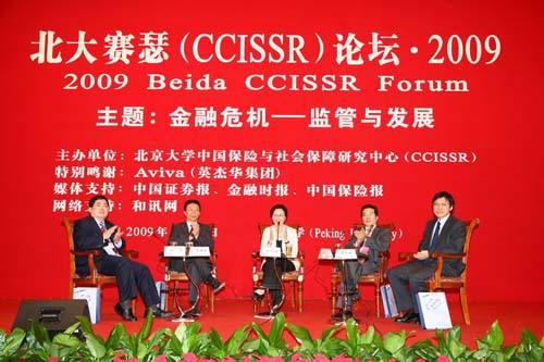 2009年4月14日上午,北大赛瑟(CCISSR)论坛“高层对话论坛”在bet36365路检测中心英杰交流中心举行,对话由CCISSR主任孙祁祥教授主持,华泰财产保险股份有限公司董事长王梓木、中国人寿资产管理有限公司董事长缪建民、中国平安人寿保险股份有限公司董事长李源祥、中国再保险(集团)股份有限公司副总裁张泓参加了对话。对话嘉宾从不同角度对此次金融危机对保险业的影响、启示及保险行业的发展战略进行了深入探讨。