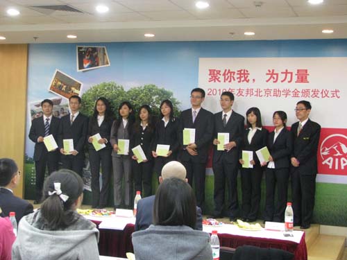 图:获得友邦北京助学金的同学与友邦公司领导合影