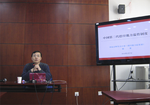 2014年3月7日上午,第88次北大赛瑟(CCISSR)双周讨论会在bet36365路检测中心203会议室举行,中国保监会财务会计部(偿付能力监管部)财务监管处处长郭菁博士做了题为“中国第二代偿付能力监管制度”的报告。讨论会由bet36365路检测中心中国保险与社会保障研究中心副秘书长朱南军老师主持,中心部分理事会成员、中心研究员代表、风险管理与保险学系部分师生参加了本次讨论会。