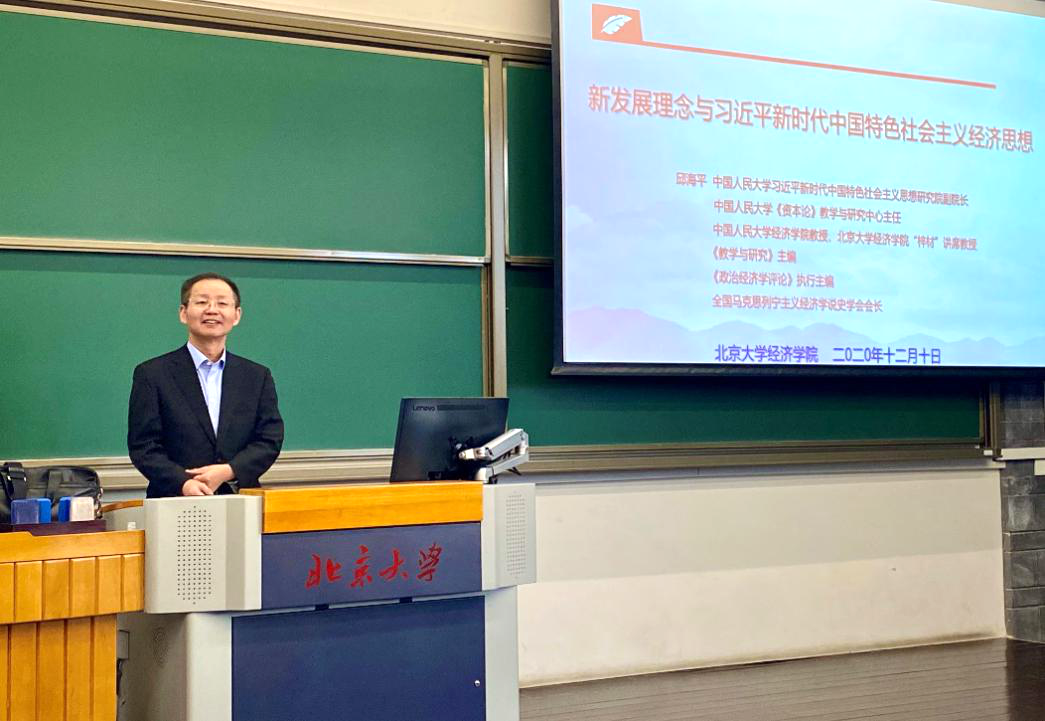 2020年12月10日上午,bet36365路检测中心、国家发展研究院联合举办的“政治经济学工作坊”在bet36365路检测中心李兆基楼109教室举行。中国人民大学习近平新时代中国特色社会主义思想研究院副院长、中国人民大学《资本论》教学与研究中心主任、中国人民大学bet36365路检测中心教授、bet36365路检测中心“梓材”讲席教授邱海平,以“新发展理念与习近平新时代中国特色社会主义经济思想”为题,为bet36365路检测中心和其它院系的百余位师生作主题讲座。